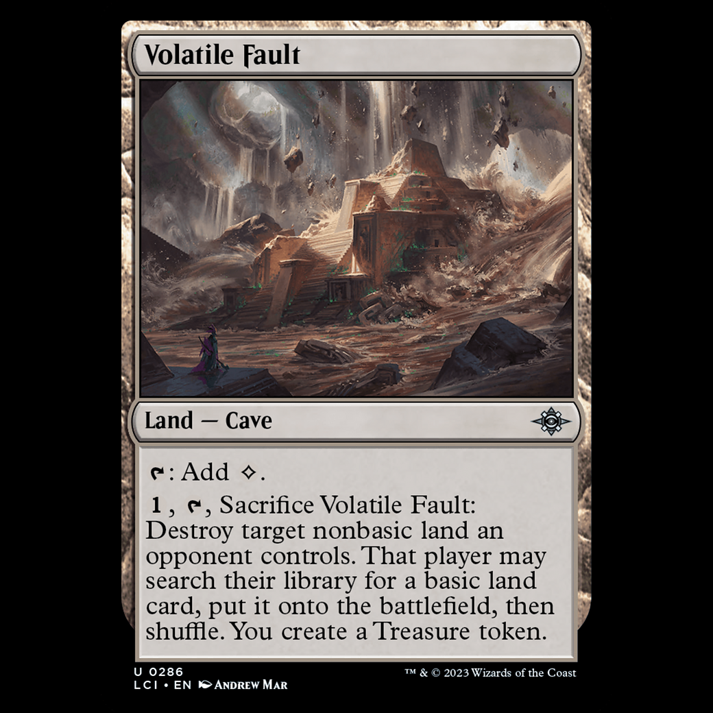 , , Sacrifice Volatile Fault: Destroy target nonbasic land an opponent controls. That player may search their library for a basic land card, put it onto the battlefield, then shuffle. You create a Treasure token.