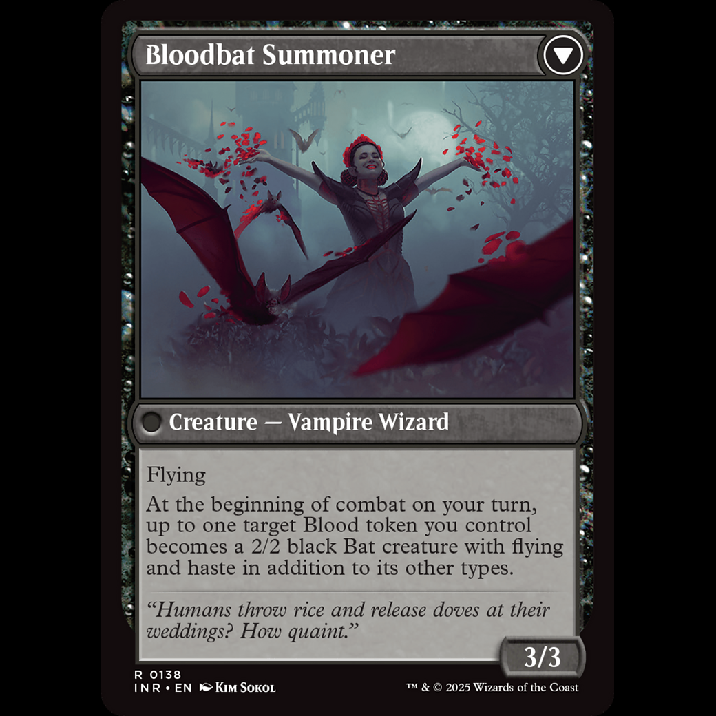 At the beginning of combat on your turn, up to one target Blood token you control becomes a 2/2 black Bat creature with flying and haste in addition to its other types.