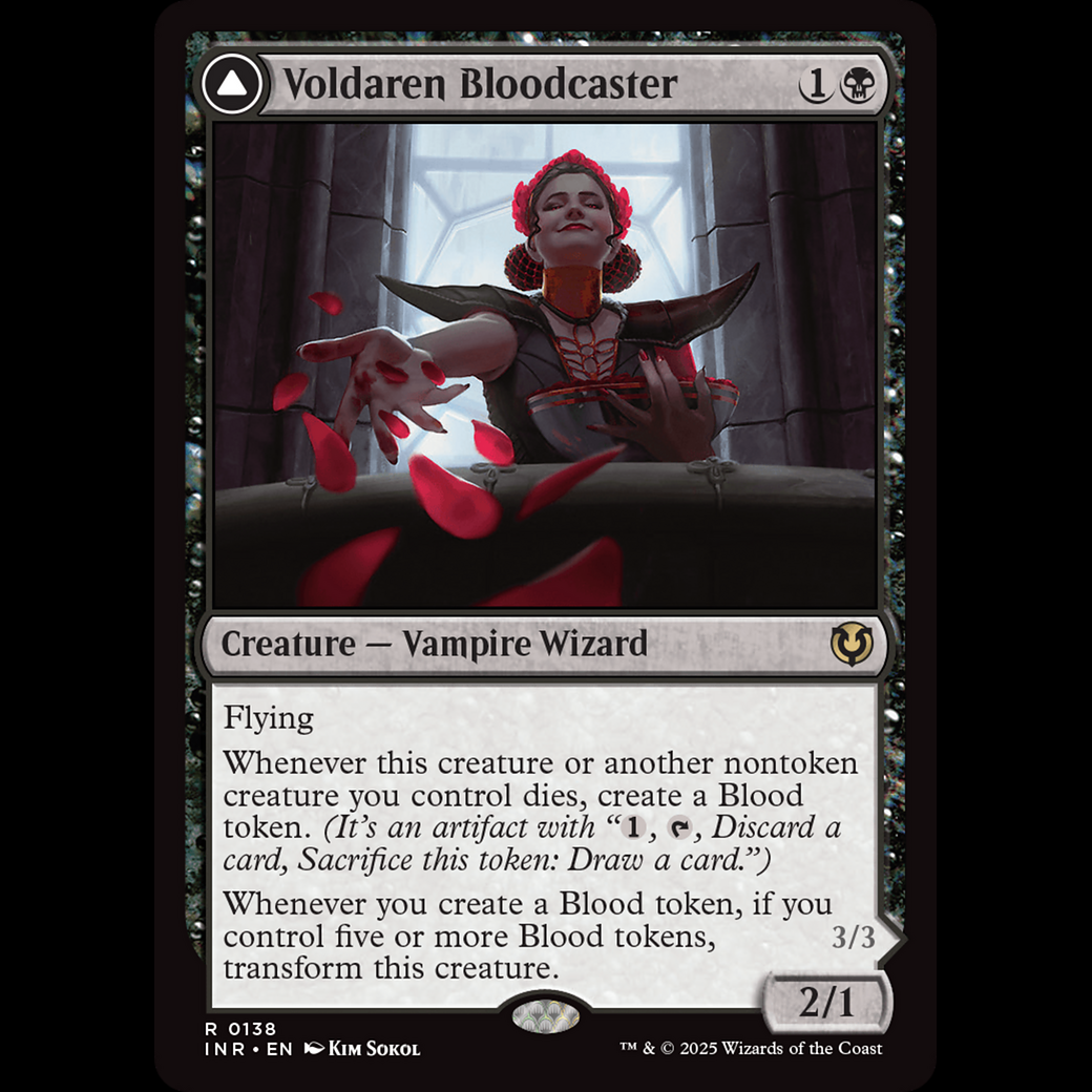 Whenever you create a Blood token, if you control five or more Blood tokens, transform Voldaren Bloodcaster.