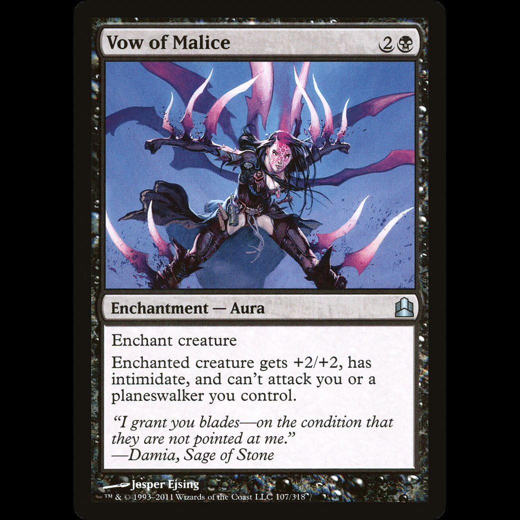 Enchanted creature gets +2/+2, has intimidate, and can't attack you or planeswalkers you control. (A creature with intimidate can't be blocked except by artifact creatures and/or creatures that share a color with it.)