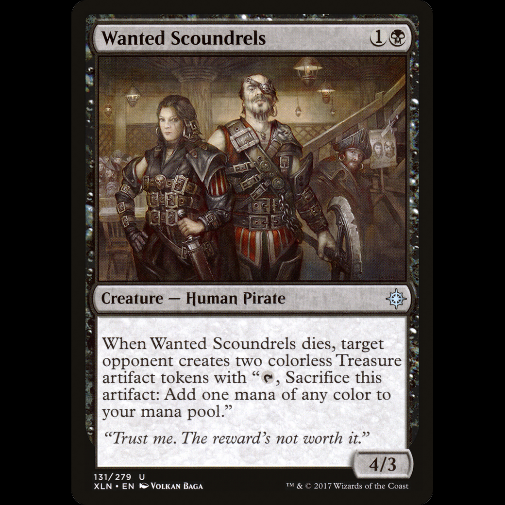 When Wanted Scoundrels dies, target opponent creates two Treasure tokens. (They're artifacts with ", Sacrifice this artifact: Add one mana of any color.")