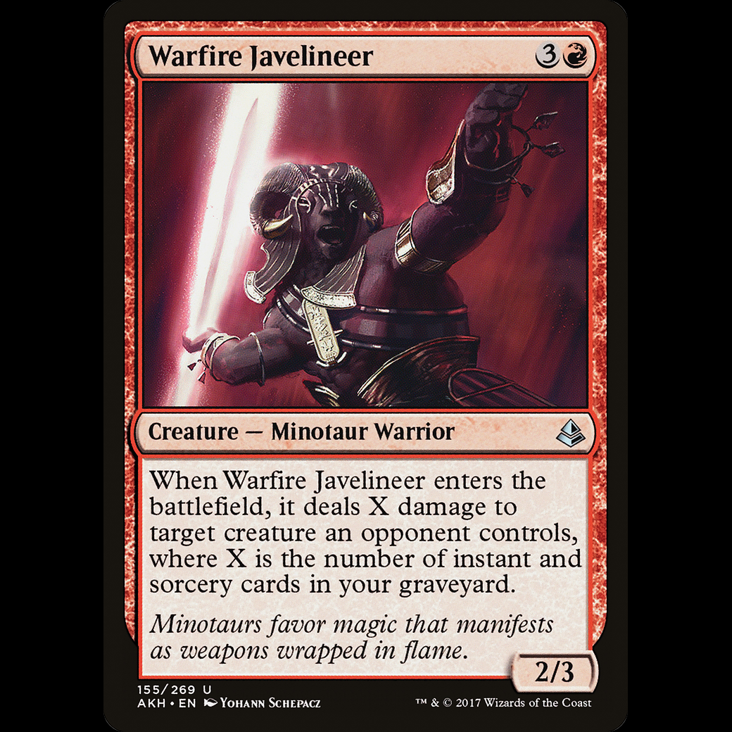 When Warfire Javelineer enters the battlefield, it deals X damage to target creature an opponent controls, where X is the number of instant and sorcery cards in your graveyard.