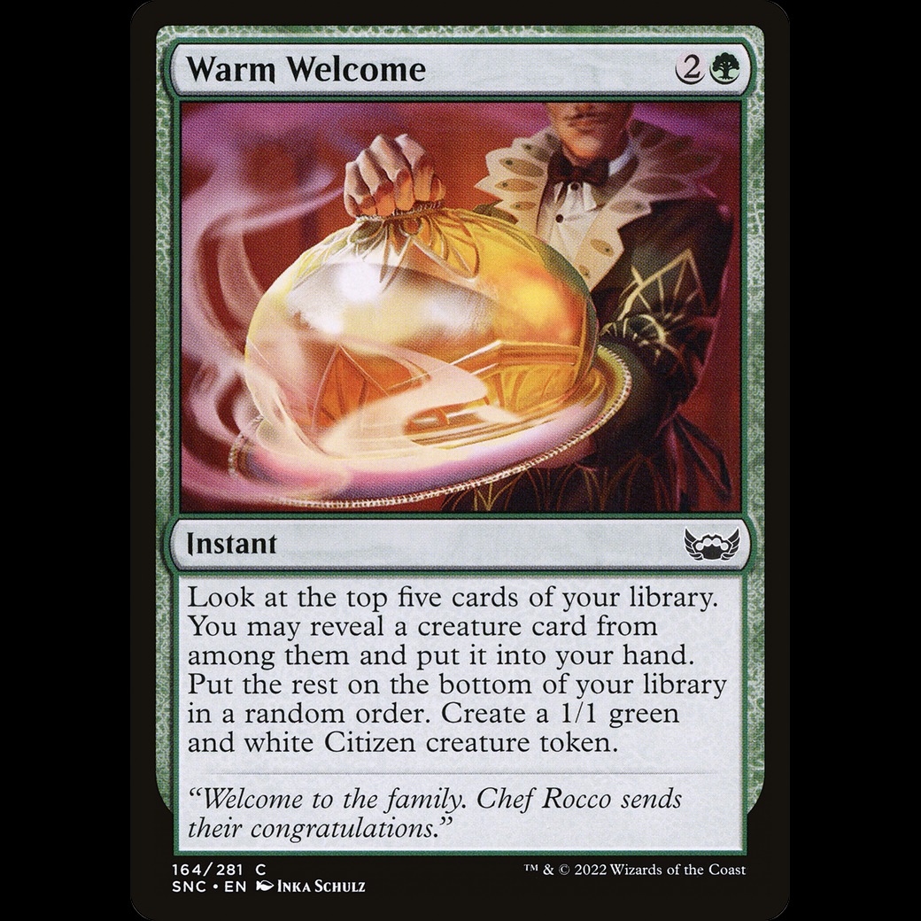Look at the top five cards of your library. You may reveal a creature card from among them and put it into your hand. Put the rest on the bottom of your library in a random order. Create a 1/1 green and white Citizen creature token.