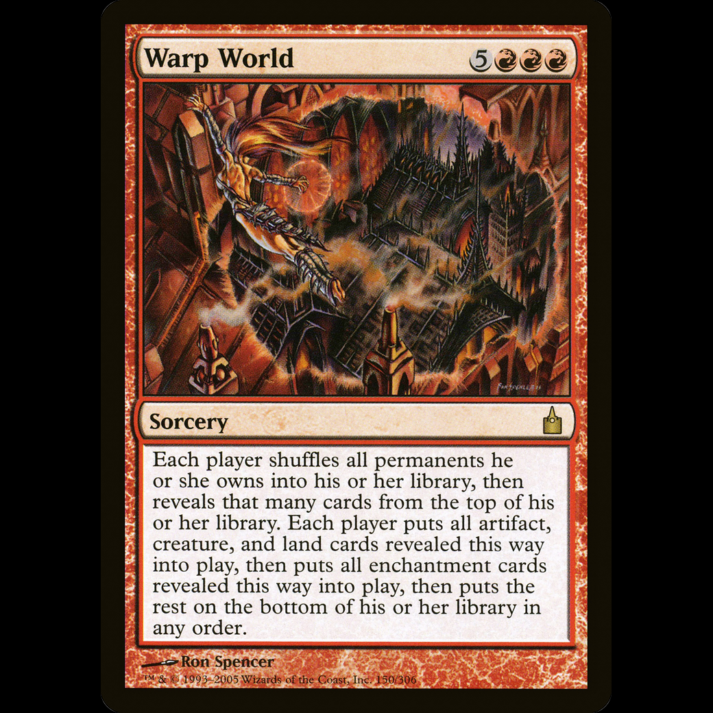 Each player shuffles all permanents they own into their library, then reveals that many cards from the top of their library. Each player puts all artifact, creature, and land cards revealed this way onto the battlefield, then does the same for enchantment cards, then puts all cards revealed this way that weren't put onto the battlefield on the bottom of their library.