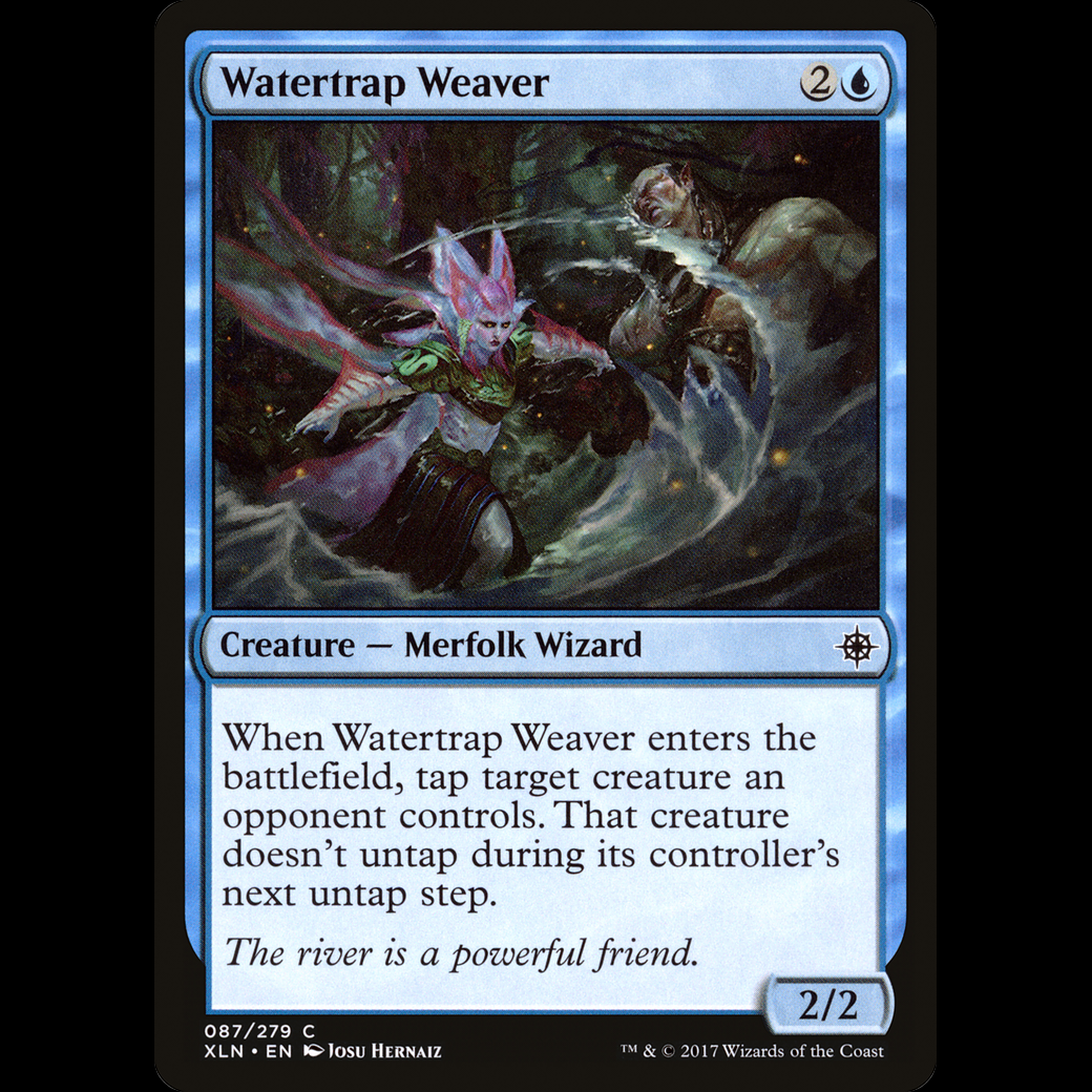 When Watertrap Weaver enters the battlefield, tap target creature an opponent controls. That creature doesn't untap during its controller's next untap step.