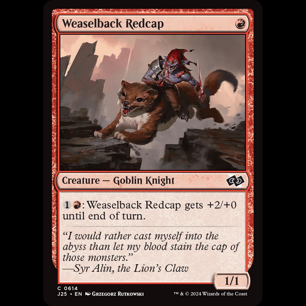 MTG Weaselback Redcap Foundations Jumpstart j25#614 : Weaselback Redcap gets +2/+0 until end of turn.