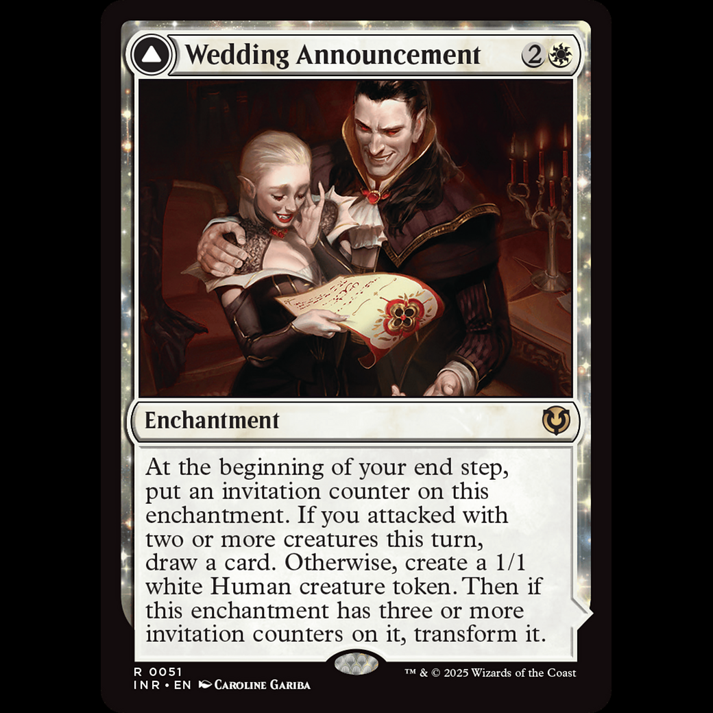 At the beginning of your end step, put an invitation counter on Wedding Announcement. If you attacked with two or more creatures this turn, draw a card. Otherwise, create a 1/1 white Human creature token. Then if Wedding Announcement has three or more invitation counters on it, transform it.