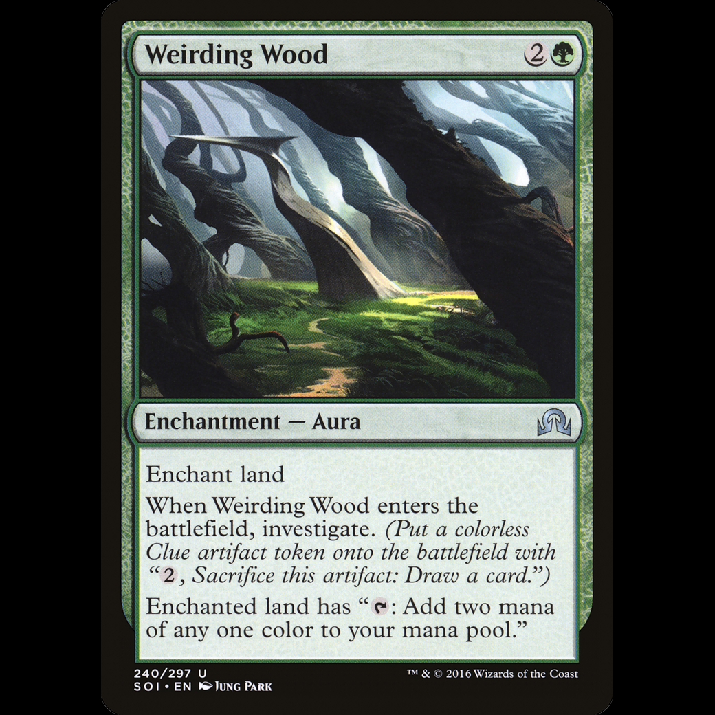 When Weirding Wood enters the battlefield, investigate. (Create a Clue token. It's an artifact with
