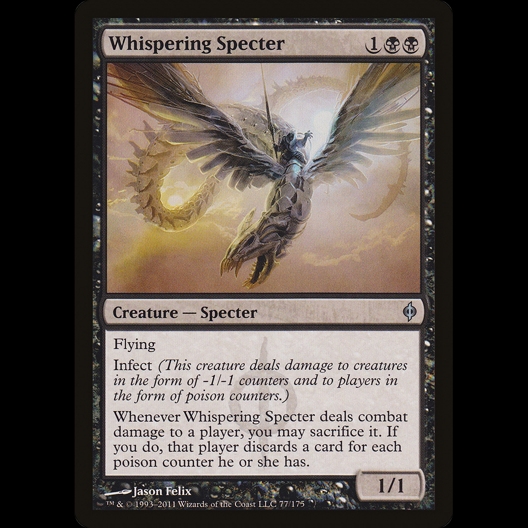 Whenever Whispering Specter deals combat damage to a player, you may sacrifice it. If you do, that player discards a card for each poison counter they have.