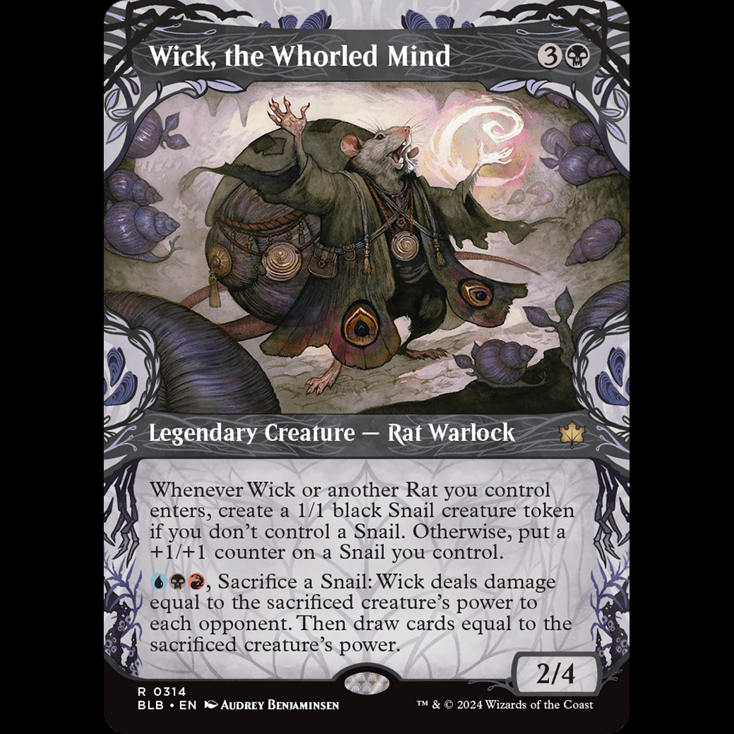 Whenever Wick or another Rat you control enters, create a 1/1 black Snail creature token if you don't control a Snail. Otherwise, put a +1/+1 counter on a Snail you control. , Sacrifice a Snail: Wick deals damage equal to the sacrificed creature's power to each opponent. Then draw cards equal to the sacrificed creature's power.