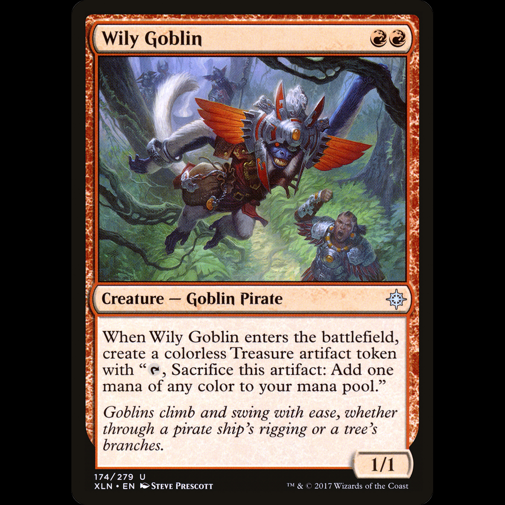 When Wily Goblin enters the battlefield, create a Treasure token. (It's an artifact with ", Sacrifice this artifact: Add one mana of any color.")