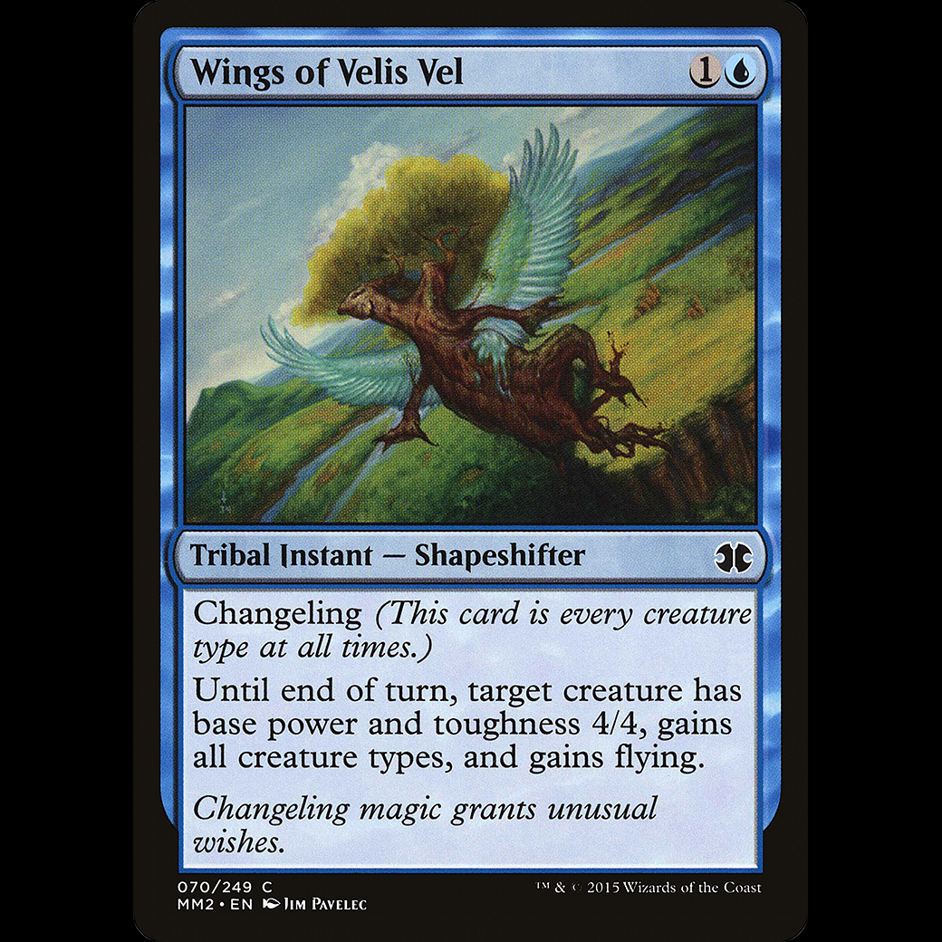 Until end of turn, target creature has base power and toughness 4/4, gains all creature types, and gains flying.