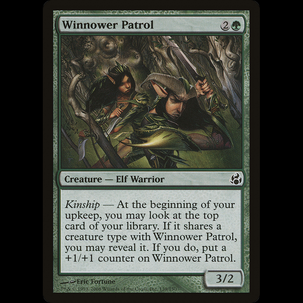Kinship — At the beginning of your upkeep, you may look at the top card of your library. If it shares a creature type with Winnower Patrol, you may reveal it. If you do, put a +1/+1 counter on Winnower Patrol.