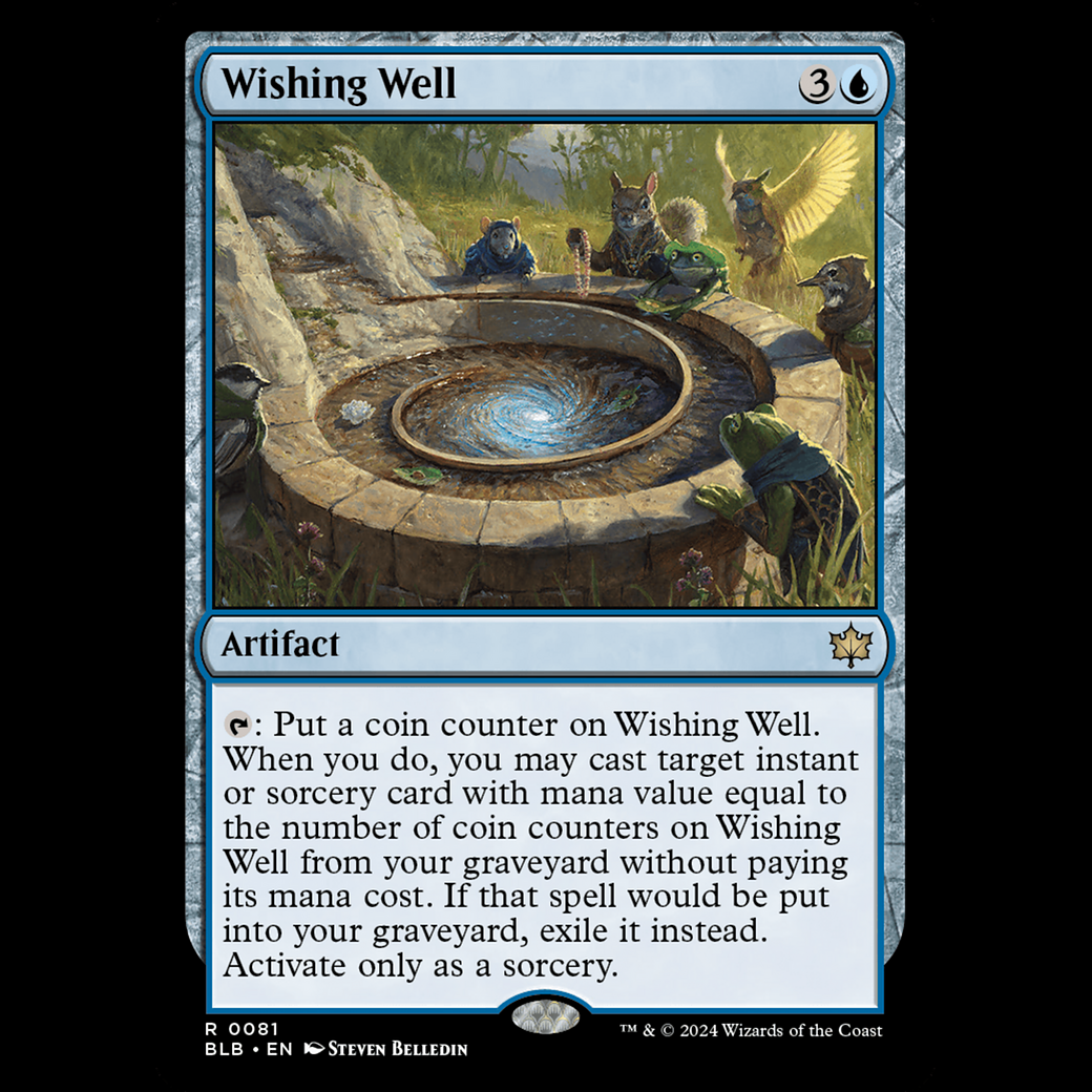 : Put a coin counter on Wishing Well. When you do, you may cast target instant or sorcery card with mana value equal to the number of coin counters on Wishing Well from your graveyard without paying its mana cost. If that spell would be put into your graveyard, exile it instead. Activate only as a sorcery.