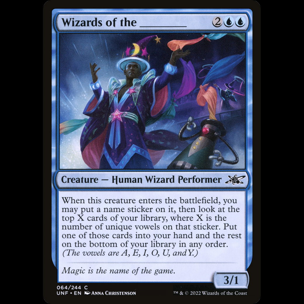 When this creature enters, you may put a name sticker on it, then look at the top X cards of your library, where X is the number of unique vowels on that sticker. Put one of those cards into your hand and the rest on the bottom of your library in any order. (The vowels are A, E, I, O, U, and Y.)
