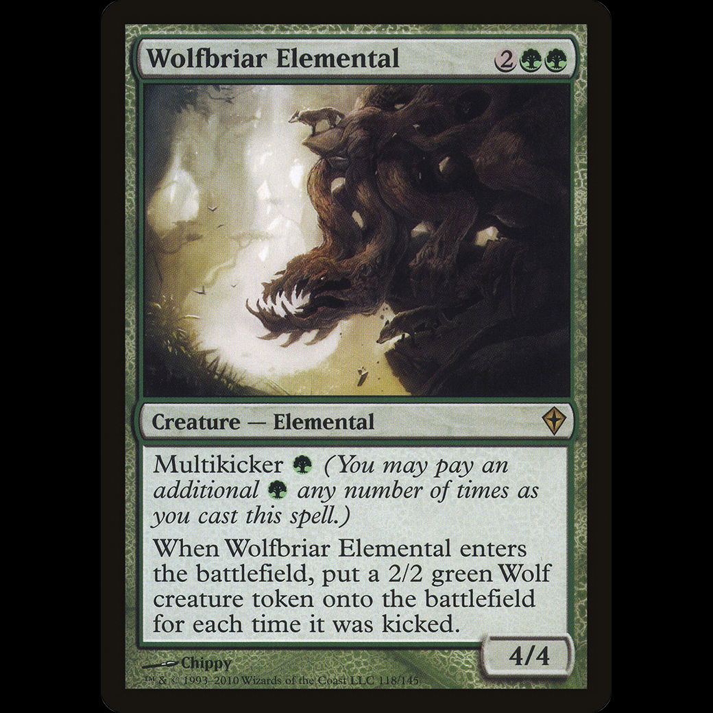 When Wolfbriar Elemental enters the battlefield, create a 2/2 green Wolf creature token for each time it was kicked.