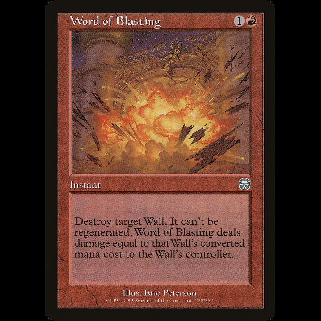 Destroy target Wall. It can't be regenerated. Word of Blasting deals damage equal to that Wall's mana value to the Wall's controller.