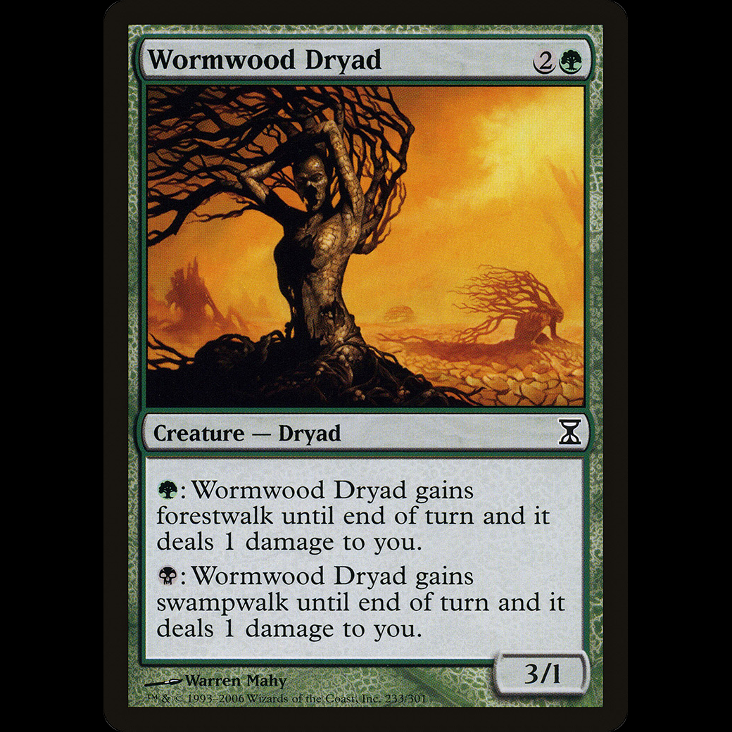 : Wormwood Dryad gains swampwalk until end of turn and deals 1 damage to you. (It can't be blocked as long as defending player controls a Swamp.)