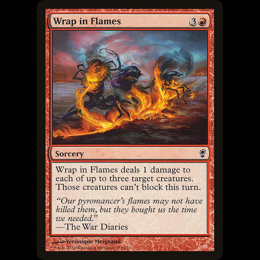 Wrap in Flames deals 1 damage to each of up to three target creatures. Those creatures can't block this turn.