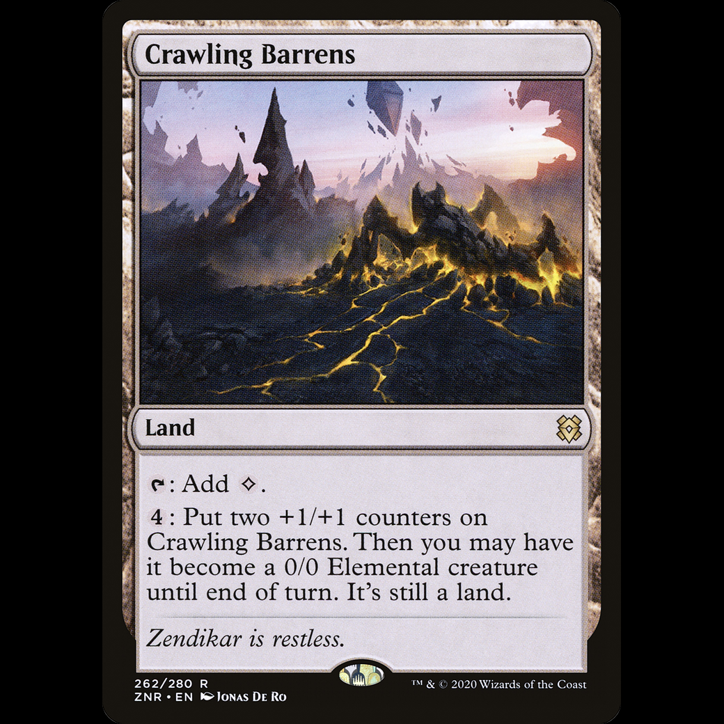 MTG Yermos reptantes (Crawling Barrens) Zendikar Rising znr#262: Add . : Put two +1/+1 counters on this land. Then you may have it become a 0/0 Elemental creature until end of turn. It's still a land.