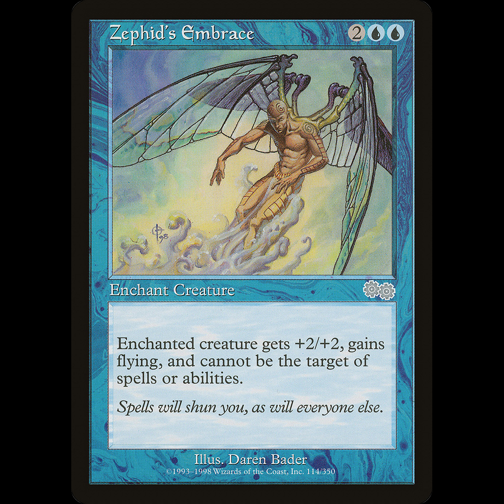 Enchanted creature gets +2/+2 and has flying and shroud. (It can't be the target of spells or abilities.)