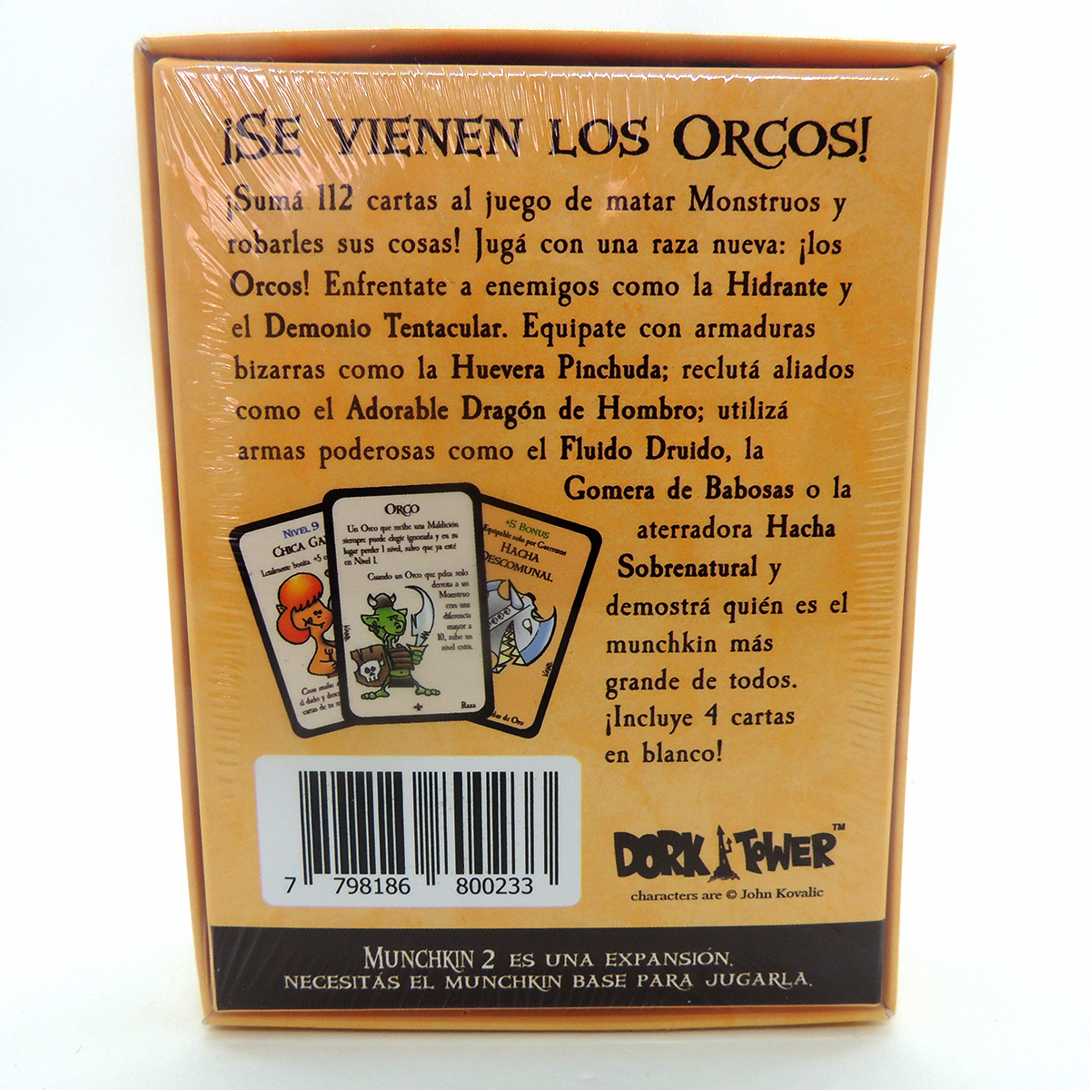 - ¡Sumá 115 cartas al juego de matar monstruos y robarles sus cosas! Jugá con una raza nueva: ¡los Orcos! Enfrentate a enemigos como la Hidrante y el Demonio Tentacular. Equipate con armaduras bizarras como la Huevera Pinchuda; reclutá aliados como el Adorable Dragón de Hombro; utilizá armas poderosas como el Fluido Druido, la Gomera de Babosas o la aterradora Hacha Sobrenatural y demostrá quién es el munchkin más grande de todos. ¡Incluye 4 cartas en blanco!