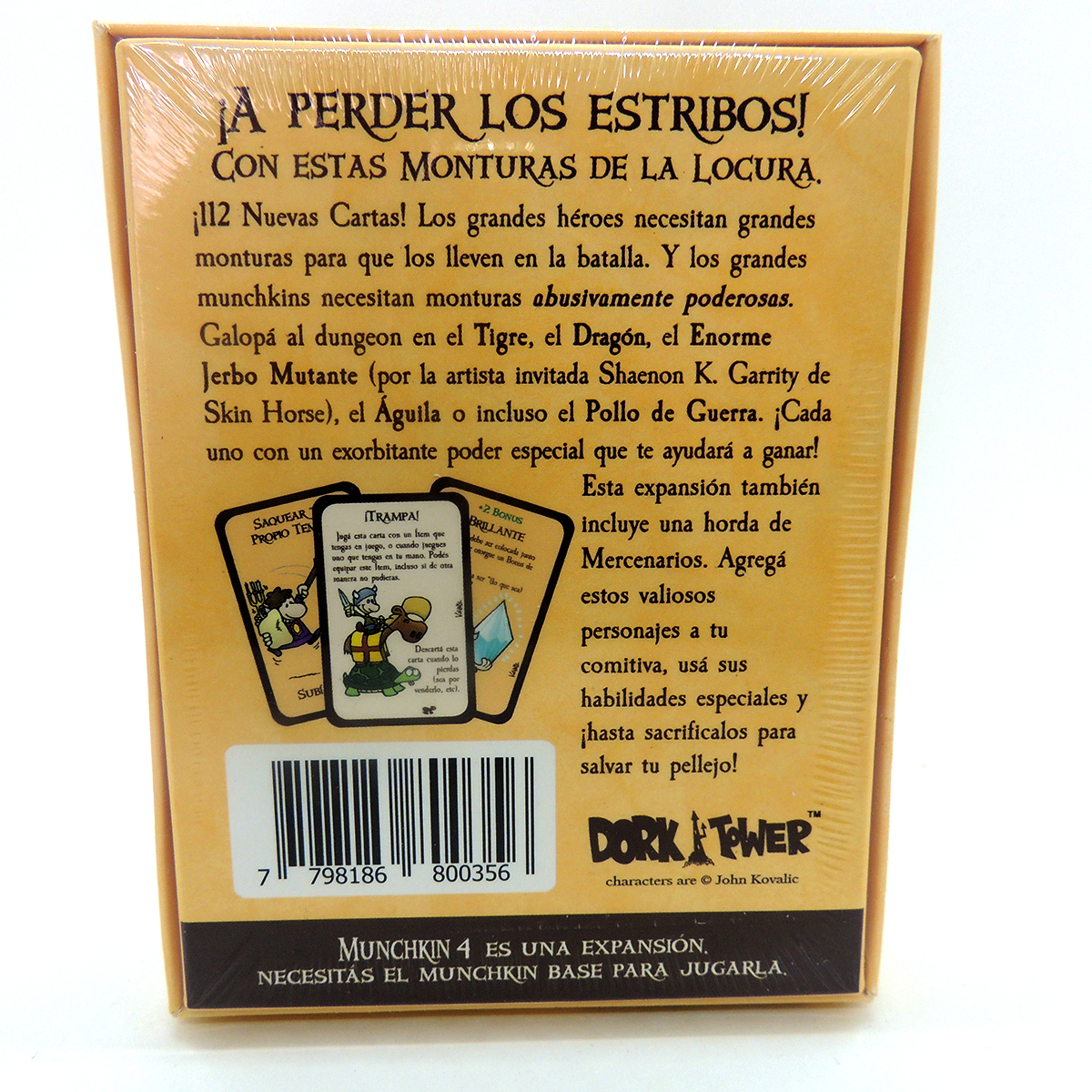 - ¡A perder los estribos! Con estas Monturas de la Locura. ¡112 Nuevas Cartas! Los grandes héroes necesitan grandes monturas para que los lleven en la batalla. Y los grandes munchkins necesitan monturas abusivamente poderosas. Galopá al dungeon en el Tigre, el Dragón, el Enorme Jerbo Mutante (por la artista invitada Shaenon K. Garrity de Skin Horse), el Águila o incluso el Pollo de Guerra. ¡Cada uno con un exorbitante poder especial que te ayudará a ganar! Esta expansión también incluye una horda de Mercenarios. Agregá estos valiosos personajes a tu comitiva, usá sus habilidades especiales y ¡hasta sacrificalos para salvar tu pellejo!